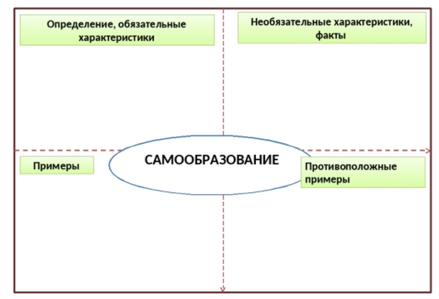 В схеме заполнить только 2 поля из четырёх (примеры и антипримеры), затем предложить группам самостоятельно заполнить поля “Определение” и “Факты/свойства” |